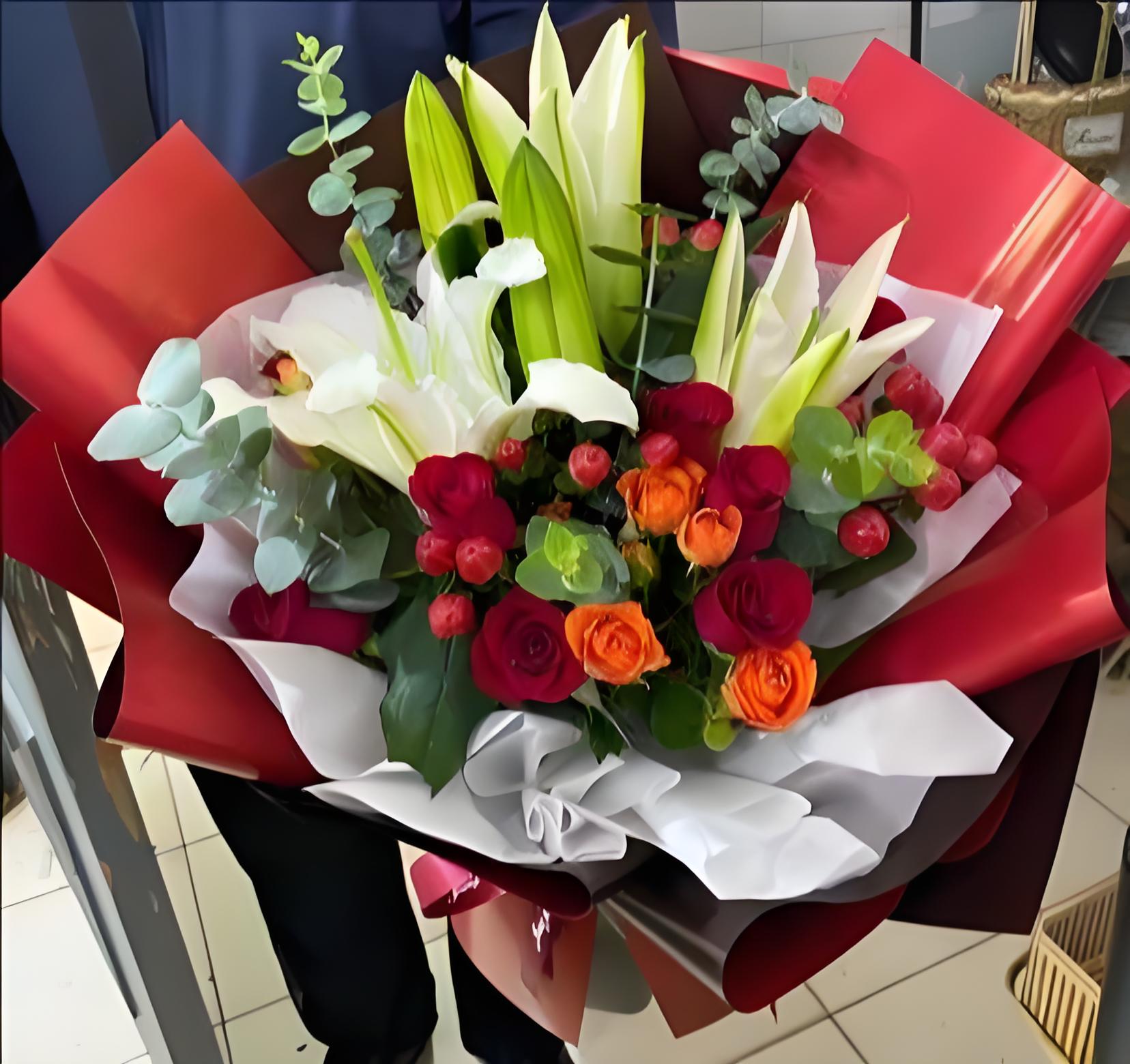 锦州义县花店包11枝红玫瑰、2枝多头白百合、6枝橙色多头玫瑰、红豆、尤加利叶